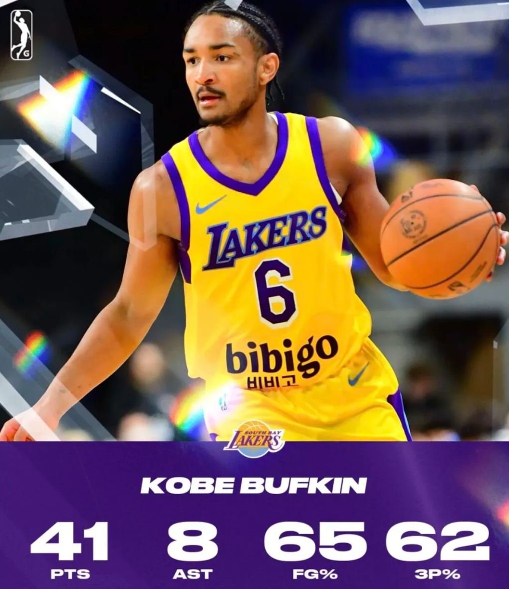 巴夫金的名字确实叫Kobe,他的父母很喜欢科比。巴夫金此前在NBA发展联盟打球,本赛季为南湾湖人队打了14场比赛,场均贡献接近28分,还曾单场轰下41分8助攻,投篮命中率高达65%。