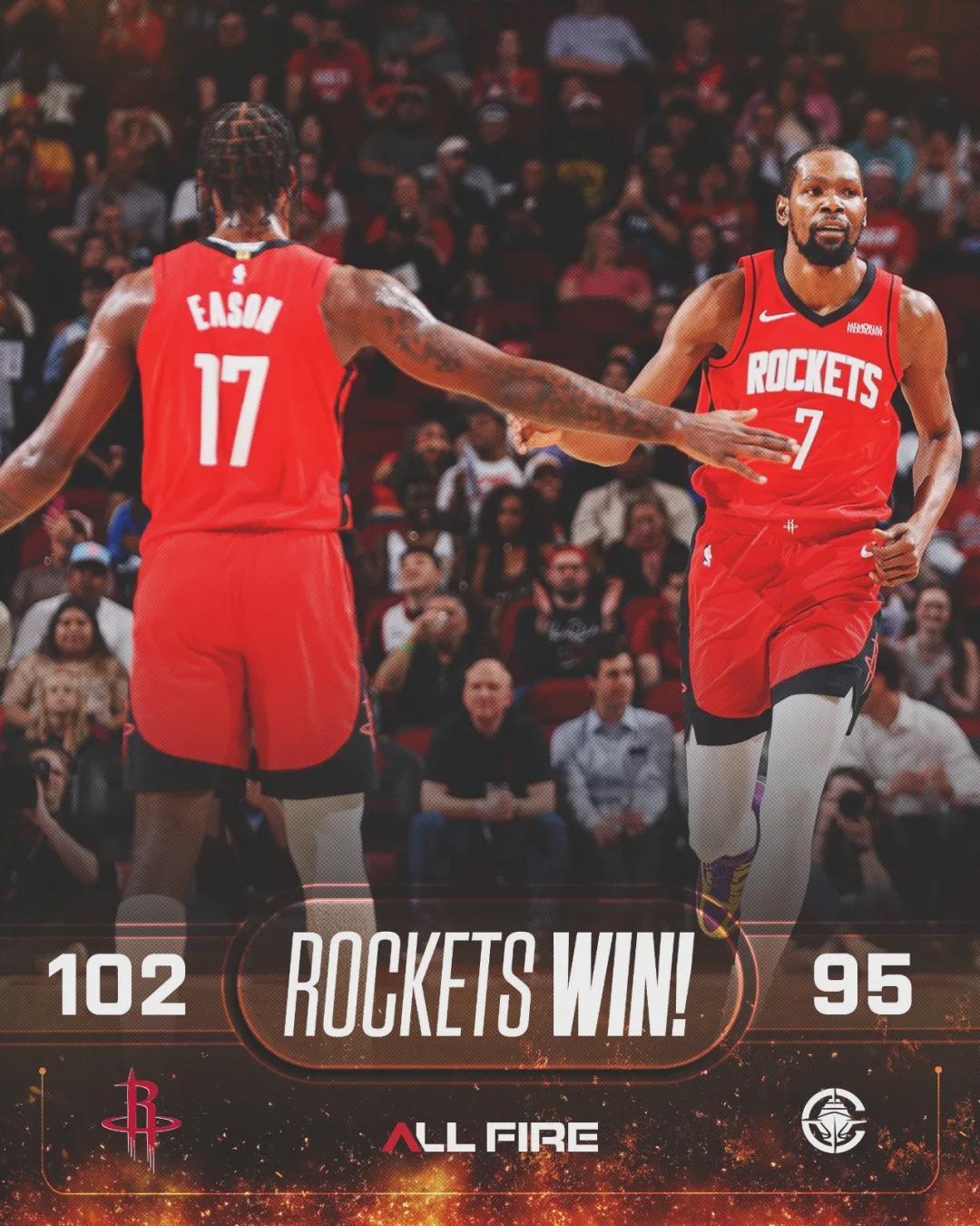 第四节开始,谢泼德组织进攻,芬尼-史密斯铁树开花,火箭一波7-0拉开到两位数。快船进攻断电,最后1分50秒谢泼德底角三分杀死比赛。全场结束,火箭102-95击败快船。明天上午9点,两队背靠背再打一场,依然是火箭主场。